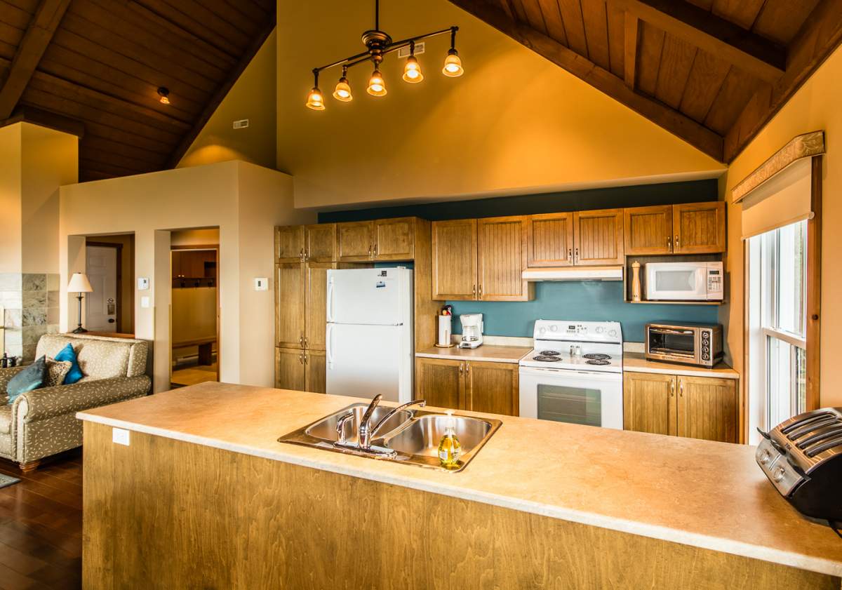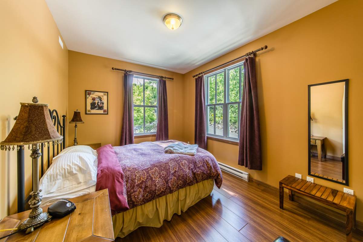 Plafond cathédrale, l’unité du haut offre 2 chambres fermées, une salle de bain complète, salon avec foyer au bois, téléviseur, salle à manger pour 6 et cuisine tout équipée.