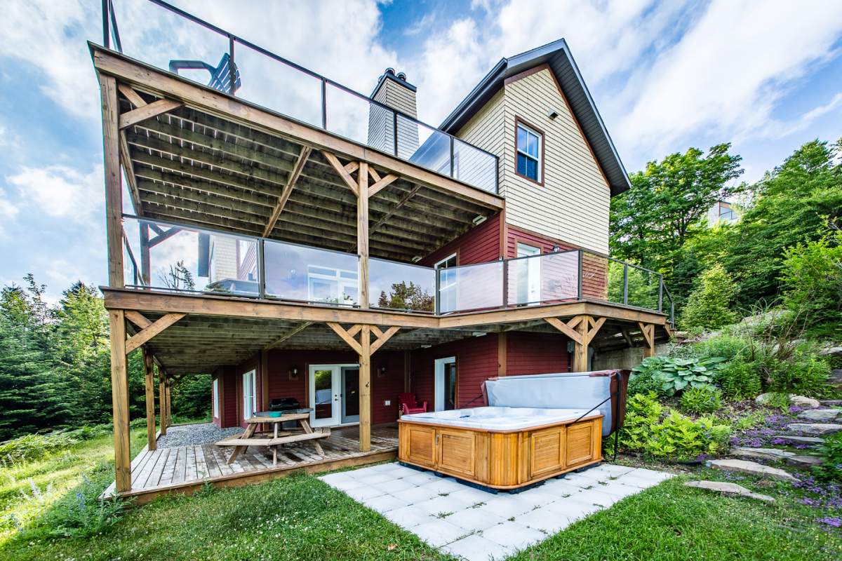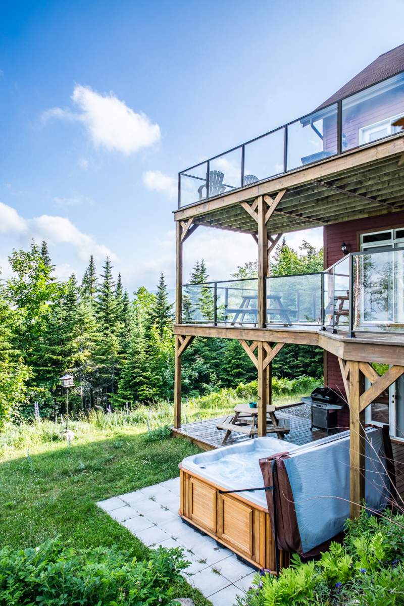 Le chalet Condo Ski Nature possède un spa, spacieux et en plein air pour profiter de moments de détente avec vue sur la nature, le fleuve et des ciels étoilés. Spa à 7 places, il est accessible pour les trois condos du chalet.