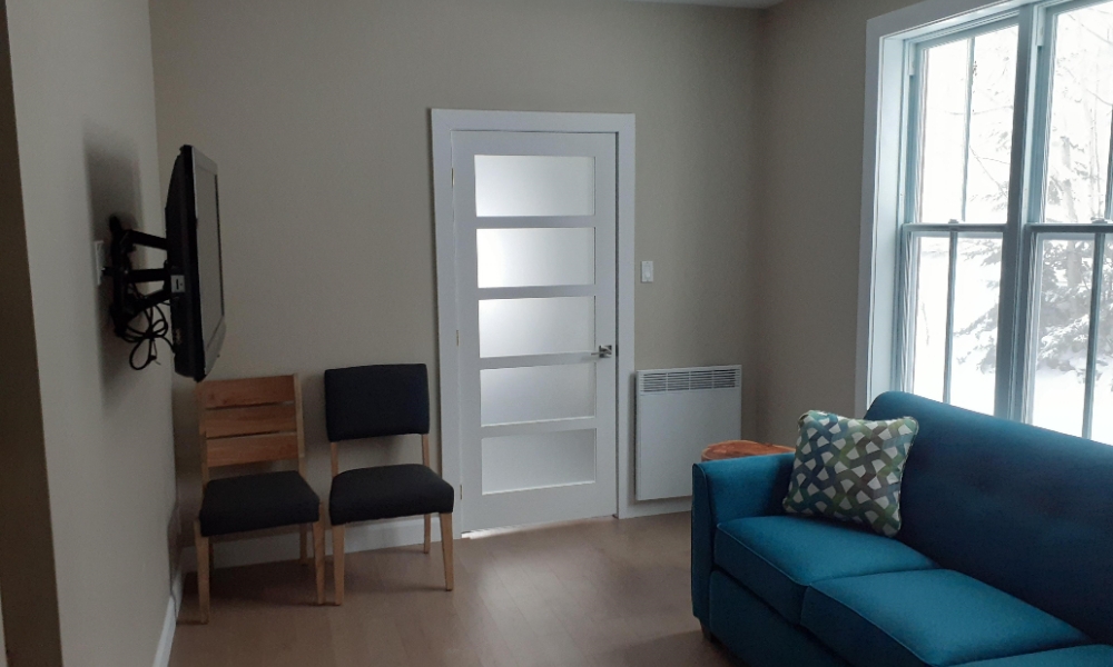 L’espace comporte de grandes fenêtres, donnant sur une vaste terrasse avec une vue incomparable sur le fleuve Saint-Laurent et les montagnes de Charlevoix!